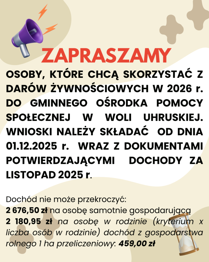 OSOBY, KTÓRE CHCĄ SKORZYSTAĆ Z DARÓW ŻYWNOŚCIOWYCH W 2026 r. DO GMINNEGO OŚRODKA POMOCY SPOŁECZNEJ W WOLI UHRUSKIEJ. WNIOSKI NALEŻY SKŁADAĆ OD DNIA 01.12.2025 r. WRAZ Z DOKUMENTAMI POTWIERDZAJĄCYMI.